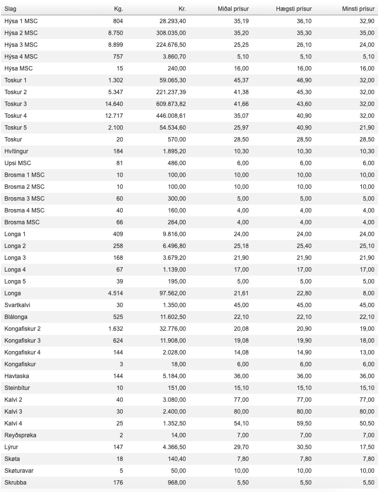 Prísir frá Fiskamarknaður Føroya 1. oktober