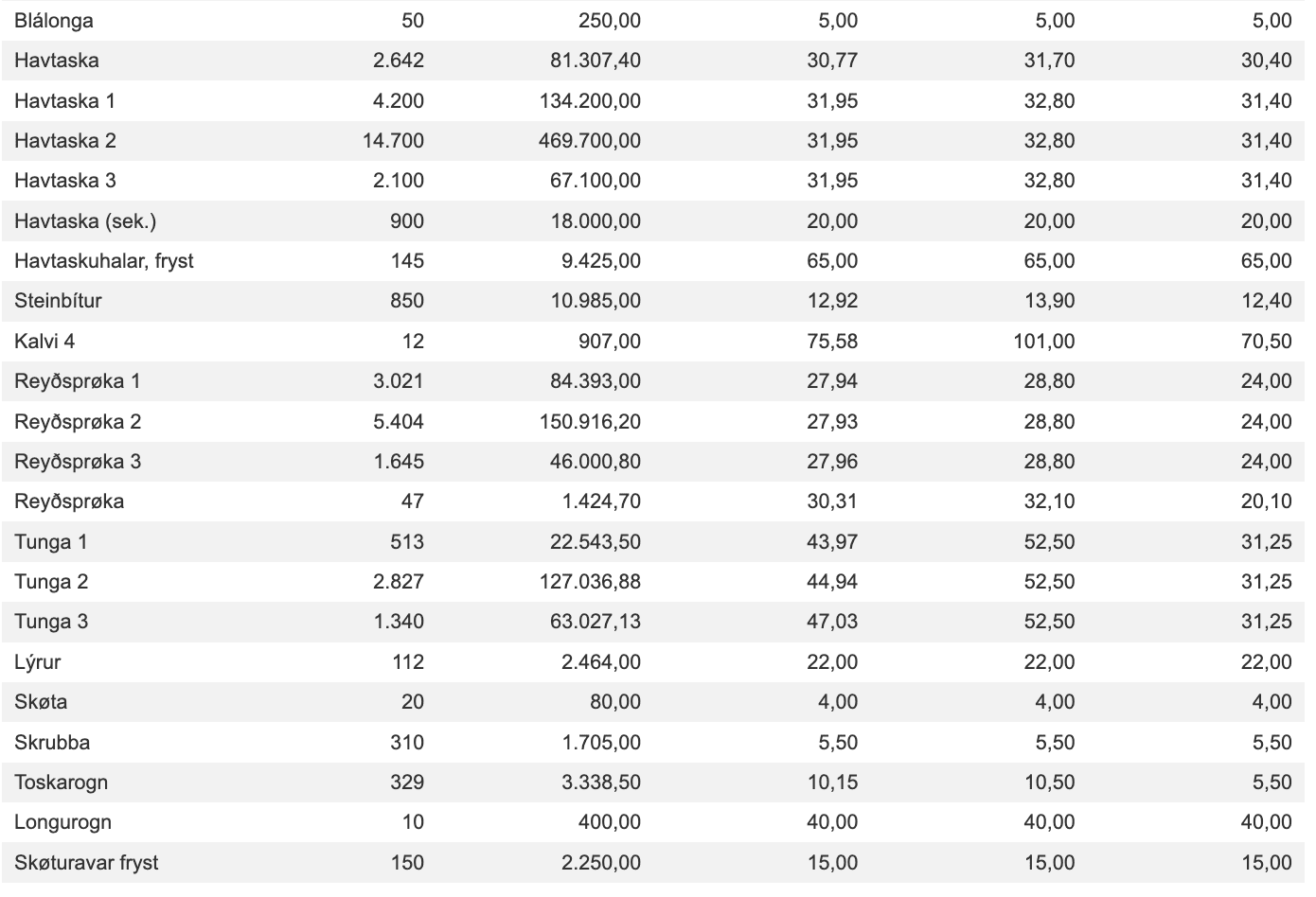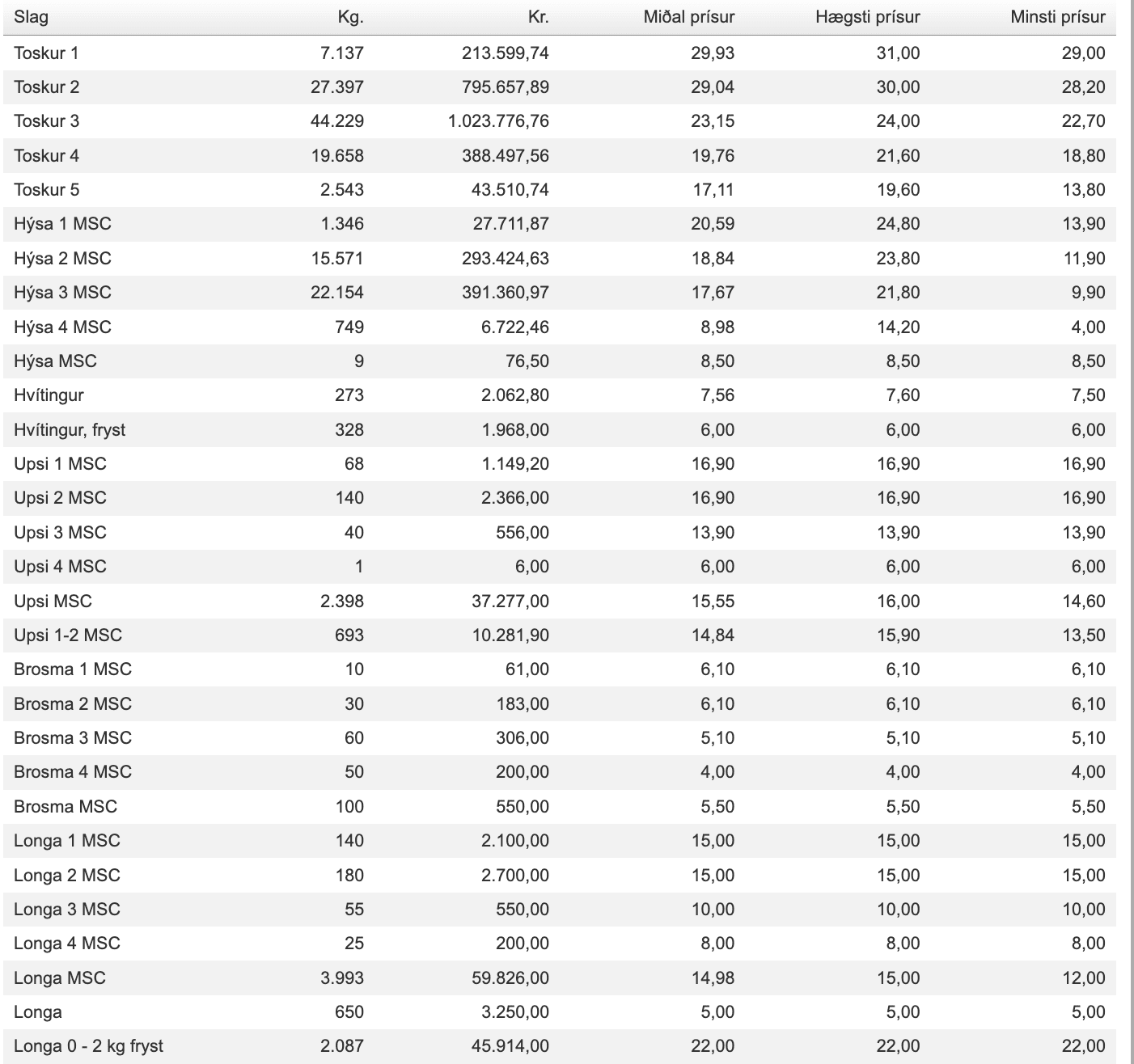 Prísir frá Fiskamarknaður Føroya 12. apríl