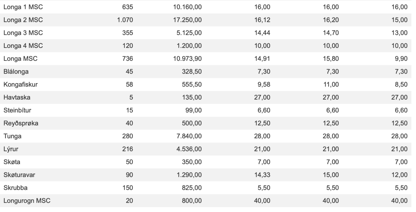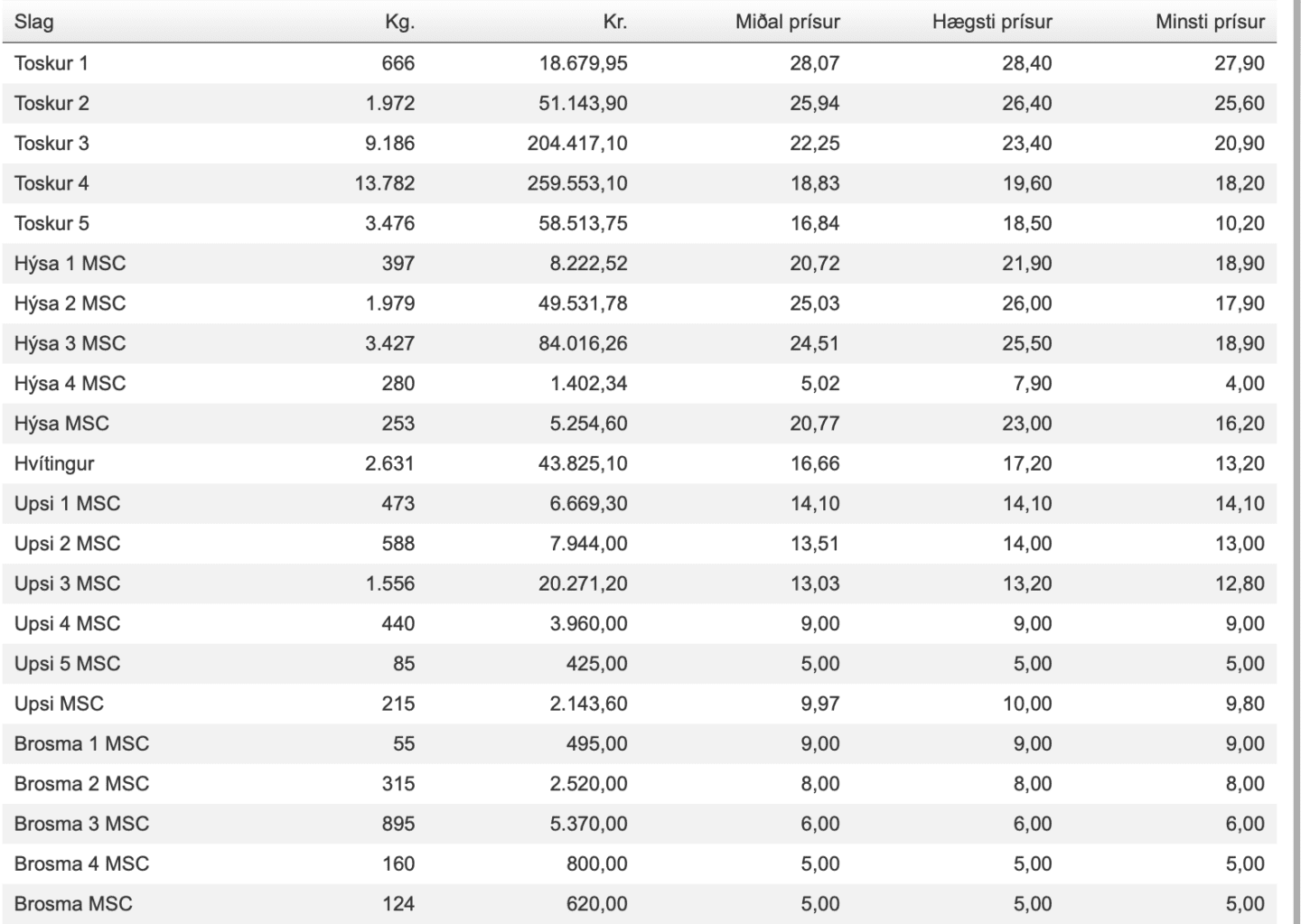 Prísir frá Fiskamarknaður Føroya í dag 12. mai.