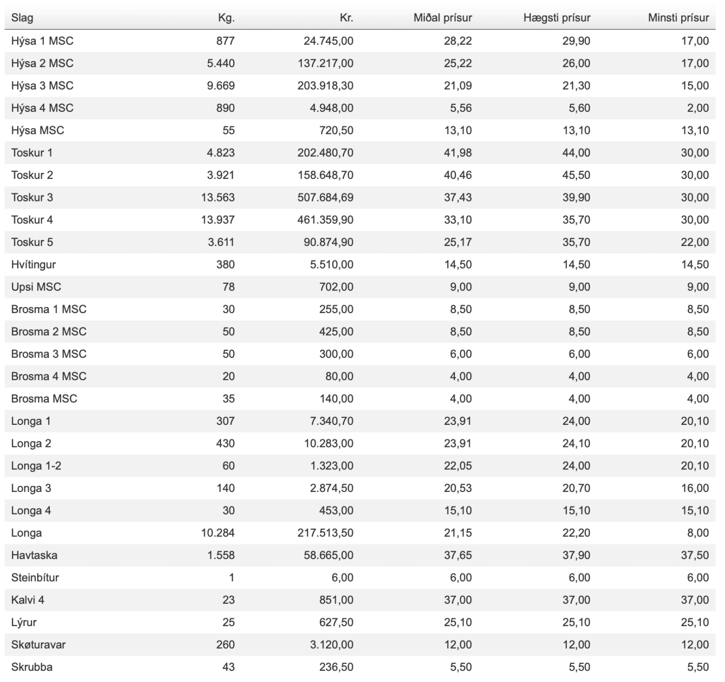 Prísir frá Fiskamarknaður Føroya 13. oktober