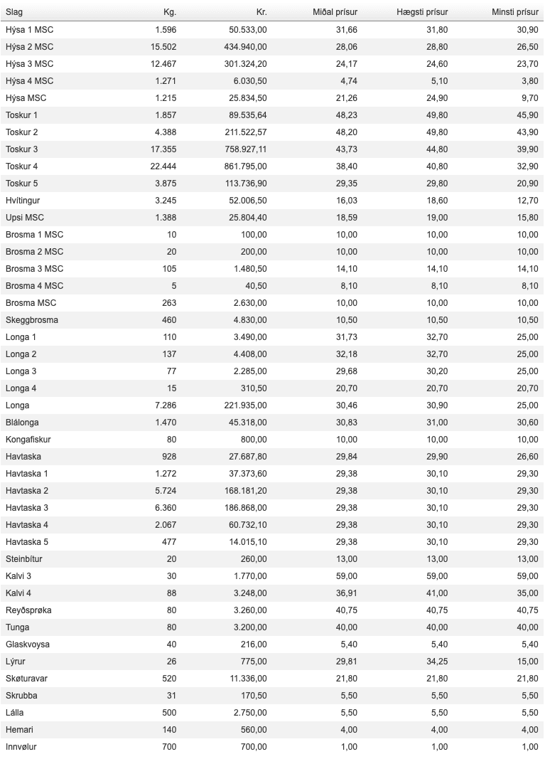 Prísir frá Fiskamarknaður Føroya 15. januar