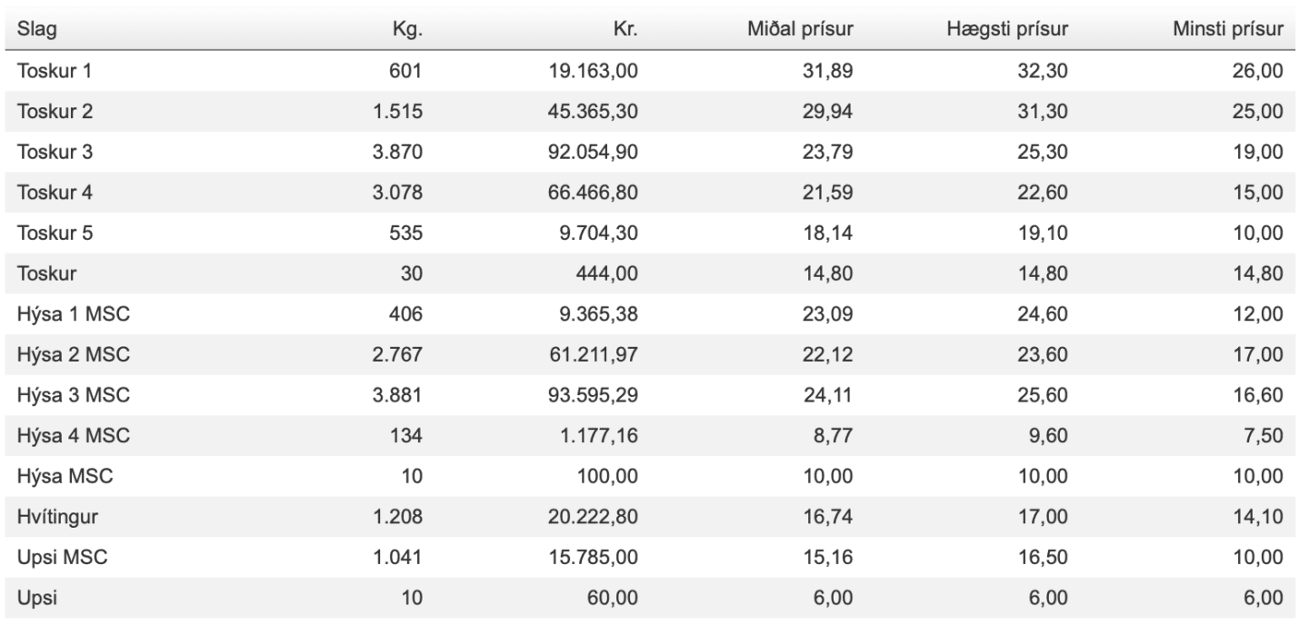 Prísir frá Fiskamarknaður Føroya í dag 15. mai.