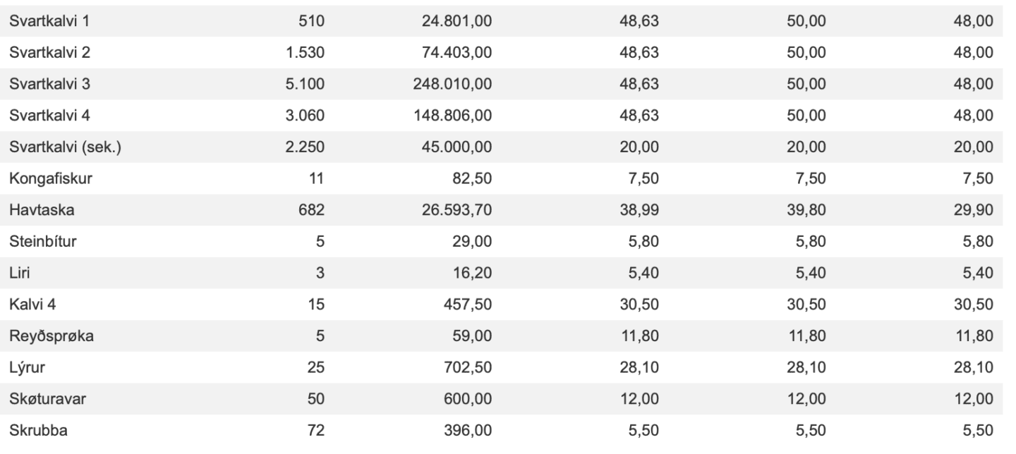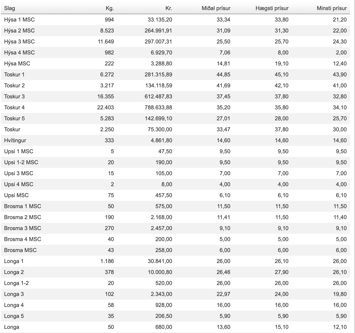 Prísir frá Fiskamarknaður Føroya 15. oktober