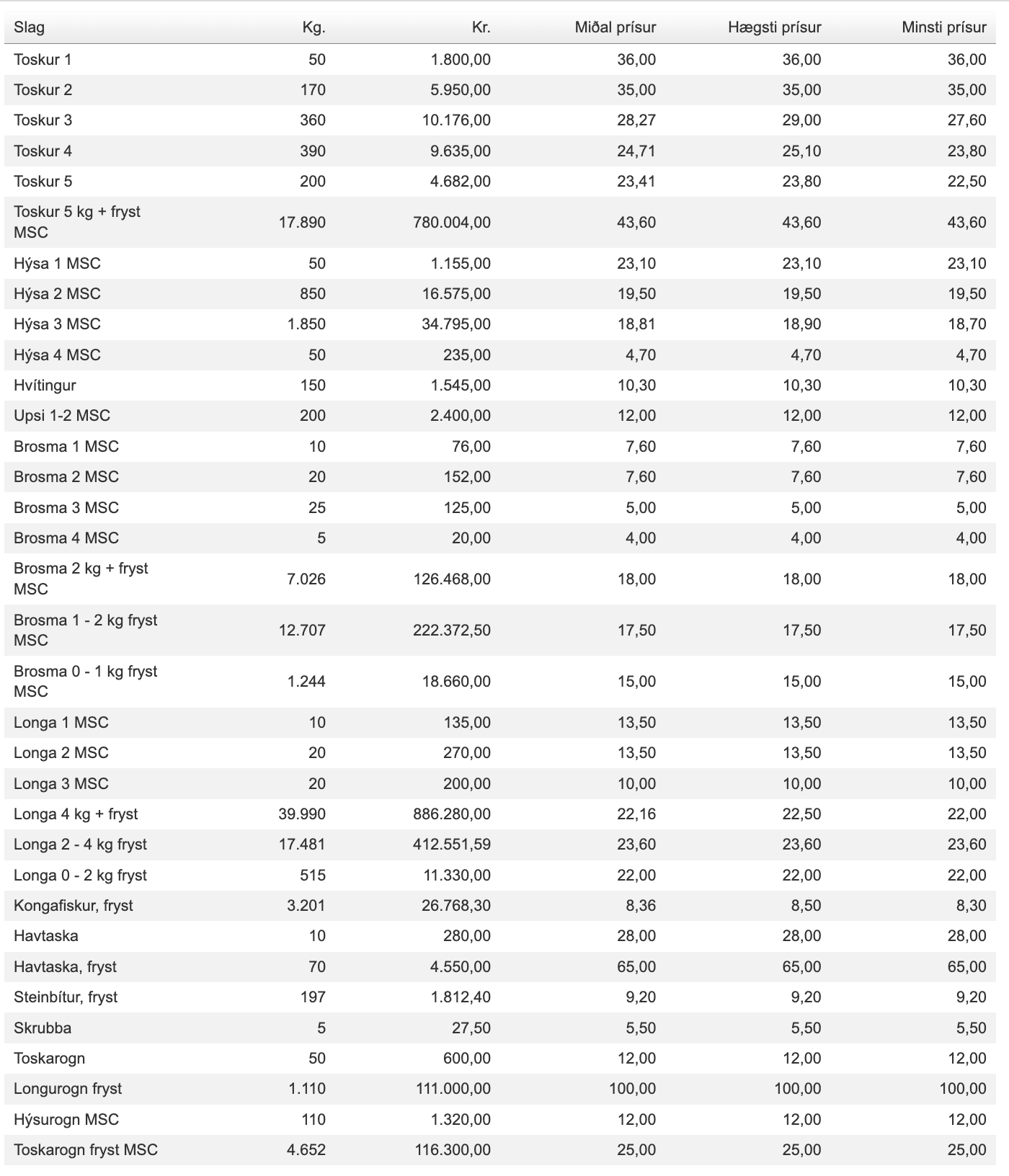 Prísir frá Fiskamarknaður Føroya í dag 16. mars.