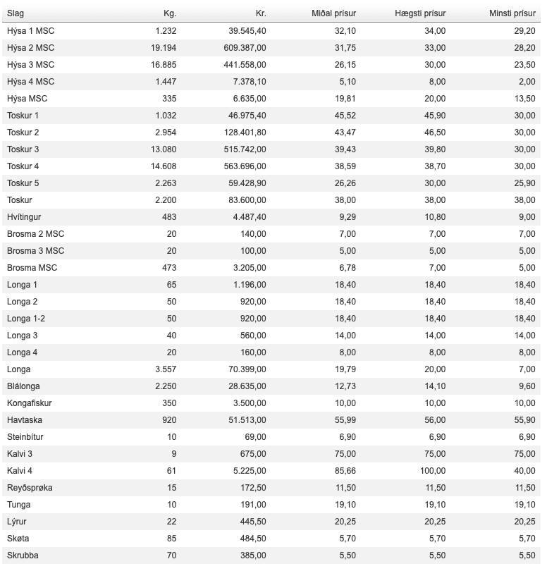 Prísir frá Fiskamarknaður Føroya 17. desember