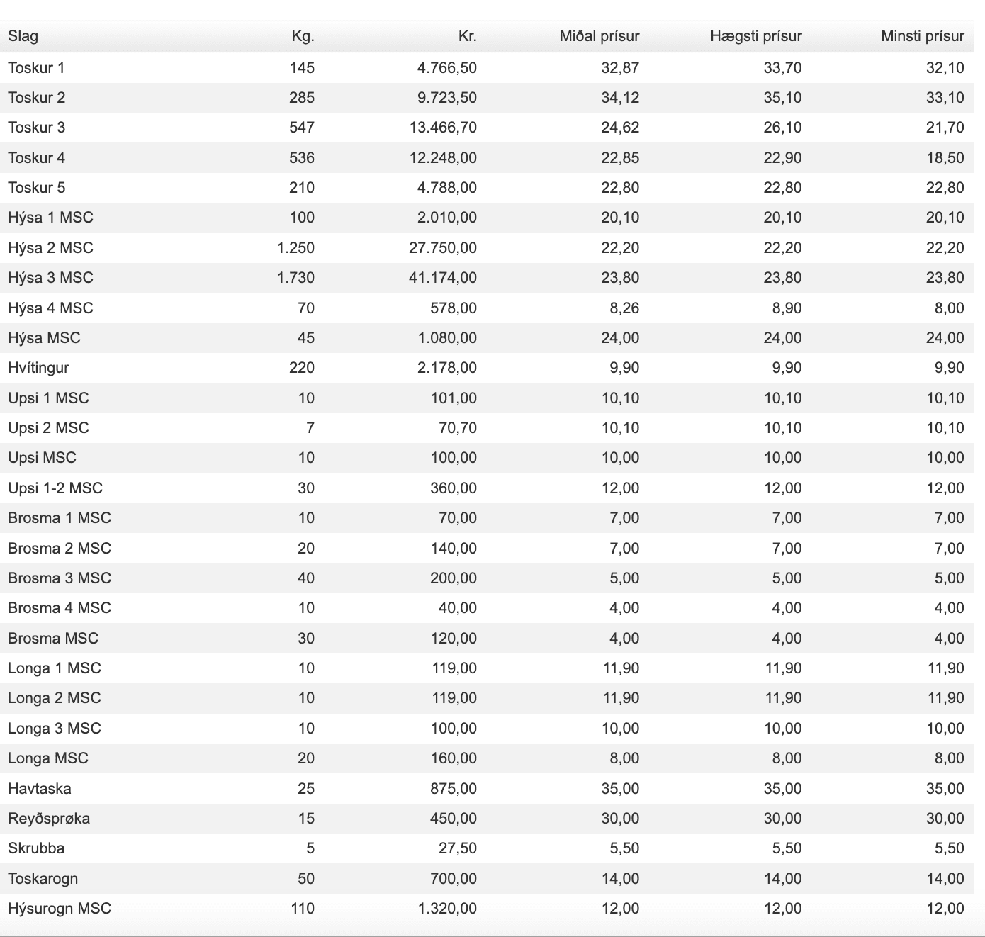 Prísir frá Fiskamarknaður Føroya í dag 17. mars.