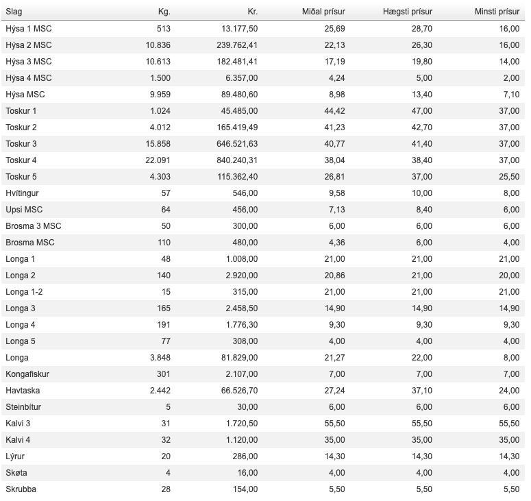 Prísir frá Fiskamarknaður Føroya 17. november.