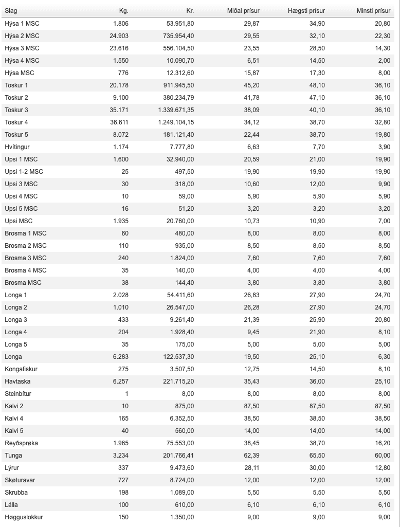 Prísir frá Fiskamarknaður Føroya 17. oktober
