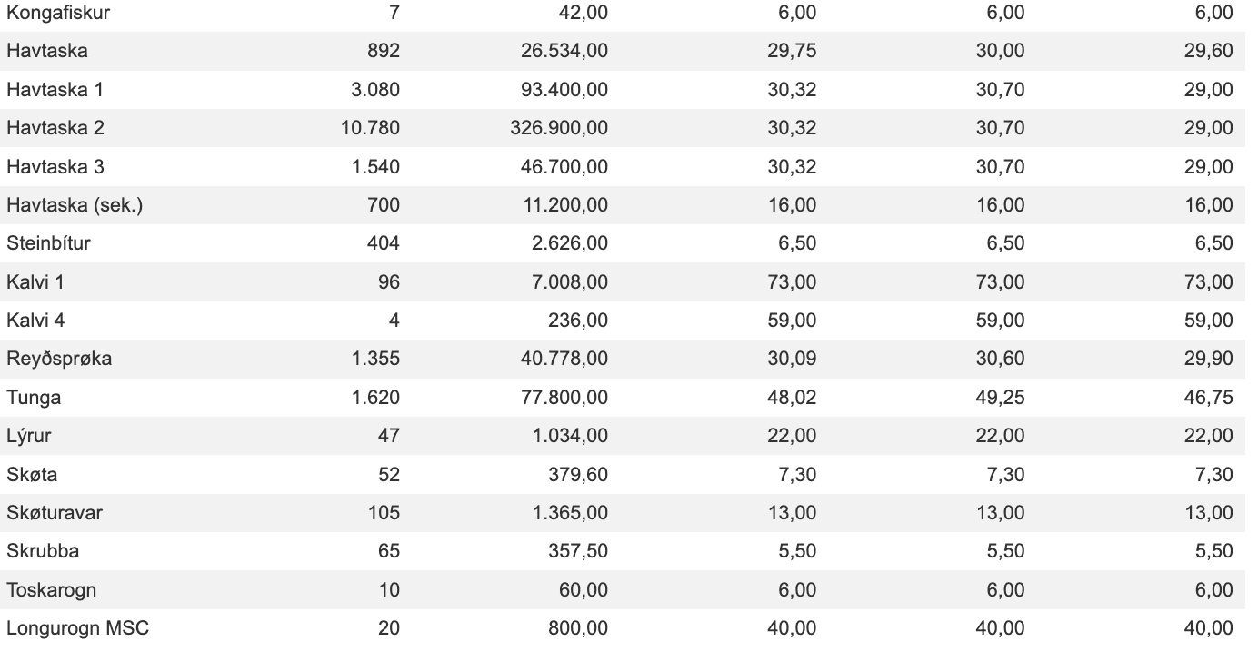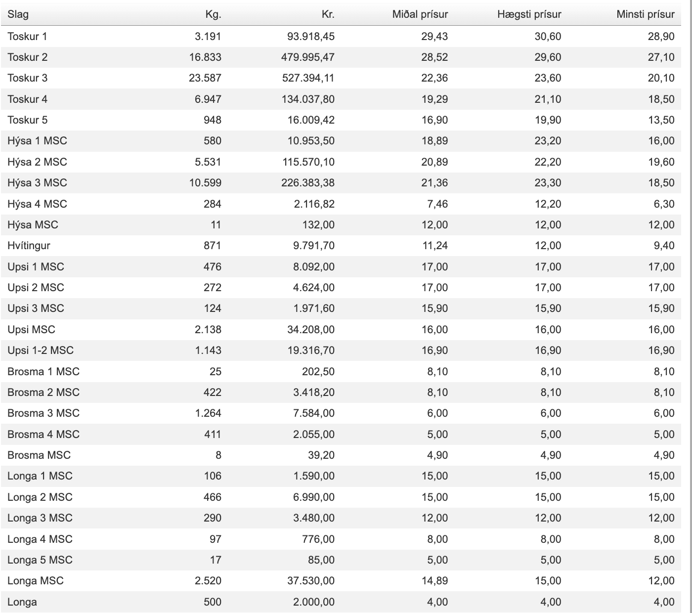 Prísir frá Fiskamarknaður Føroya í dag 19. apríl.