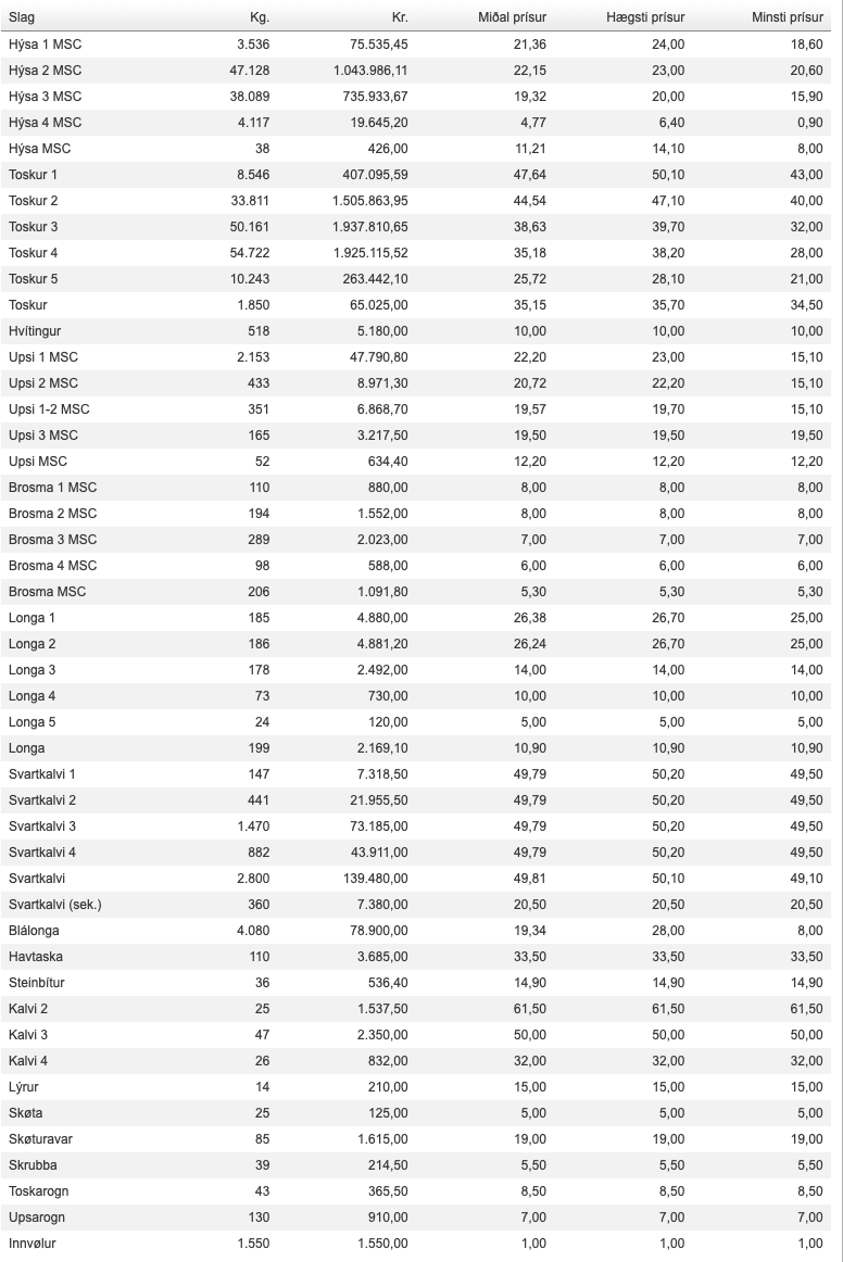 Prísir frá Fiskamarknaður Føroya 19. januar