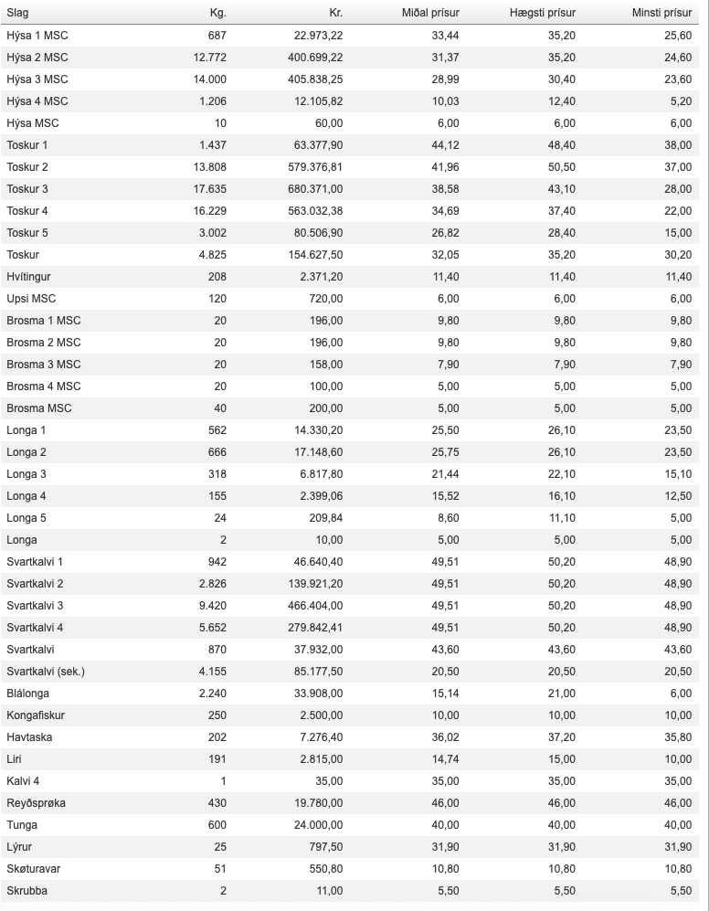 Prísir frá Fiskamarknaður Føroya 2. oktober