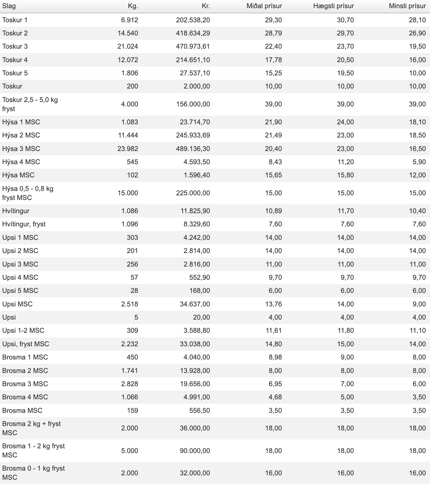 Prísir frá Fiskamarknaður Føroya 20. apríl