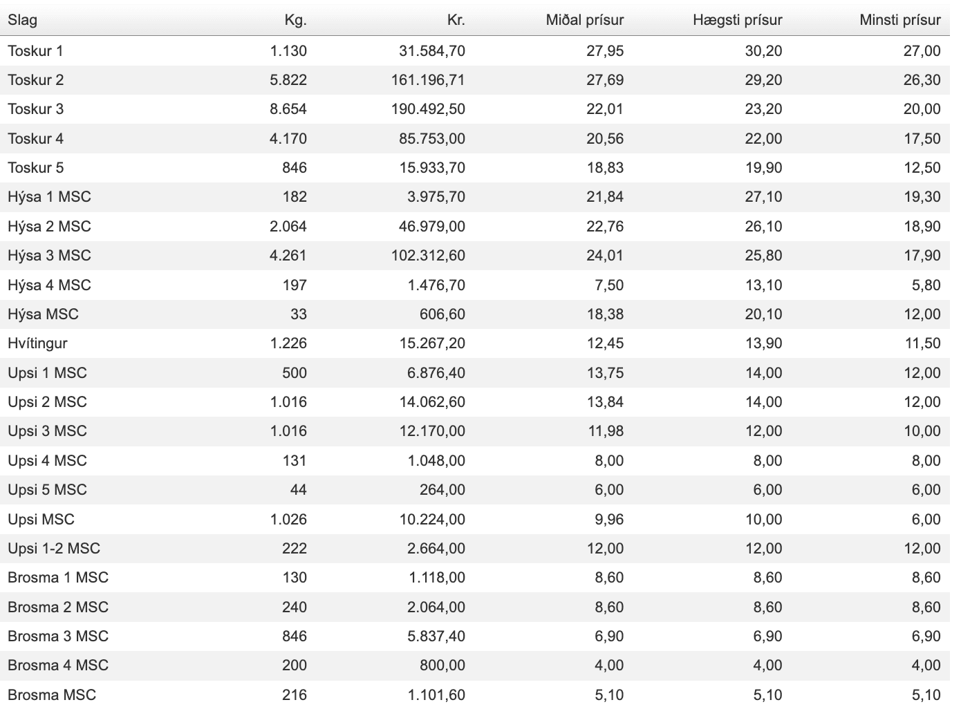 Prísir frá Fiskamarknaður Føroya í dag 21. apríl.