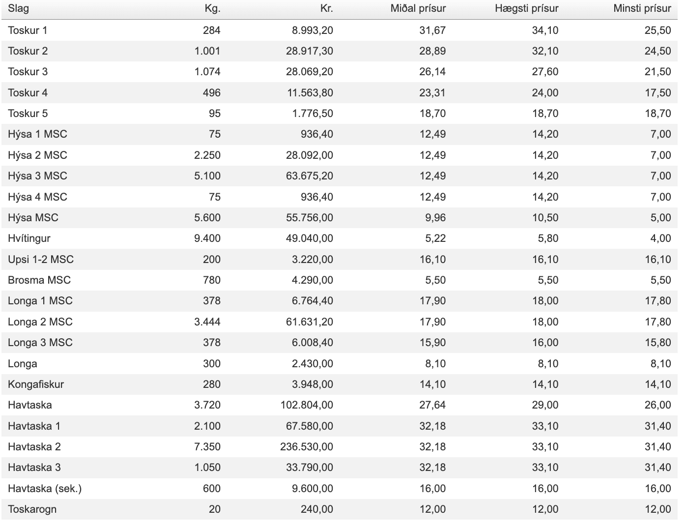 Prísir frá Fiskamarknaður Føroya í dag 20. mars.