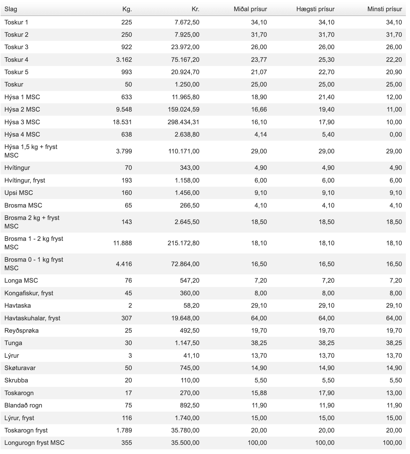 Prísir frá Fiskamarknaður Føroya 23. februar