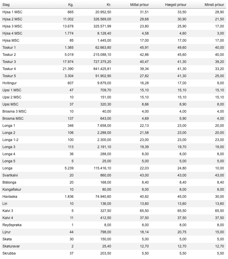 Prísir frá Fiskamarknaður Føroya 24. november.