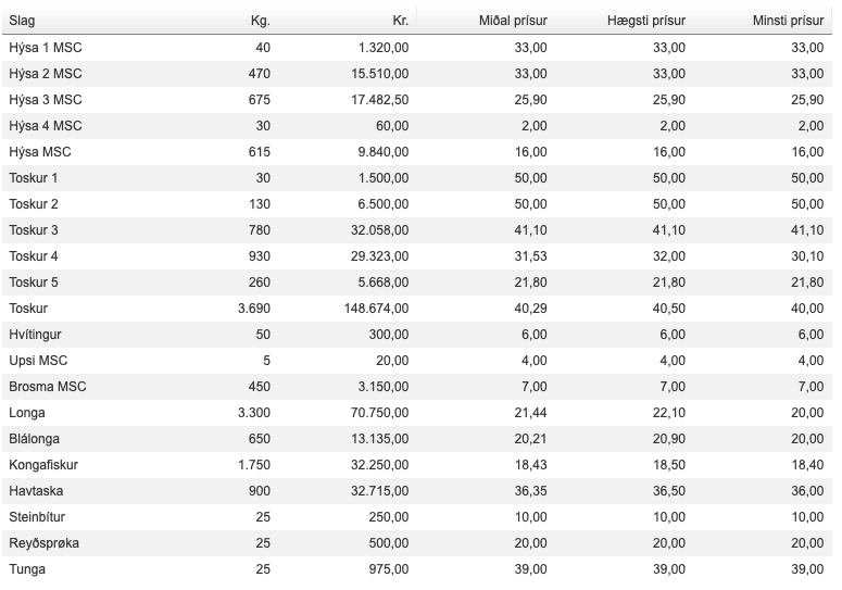 Prísir frá Fiskamarknaður Føroya 24. oktober.