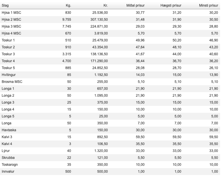 Prísir frá Fiskamarknaður Føroya 26. januar.