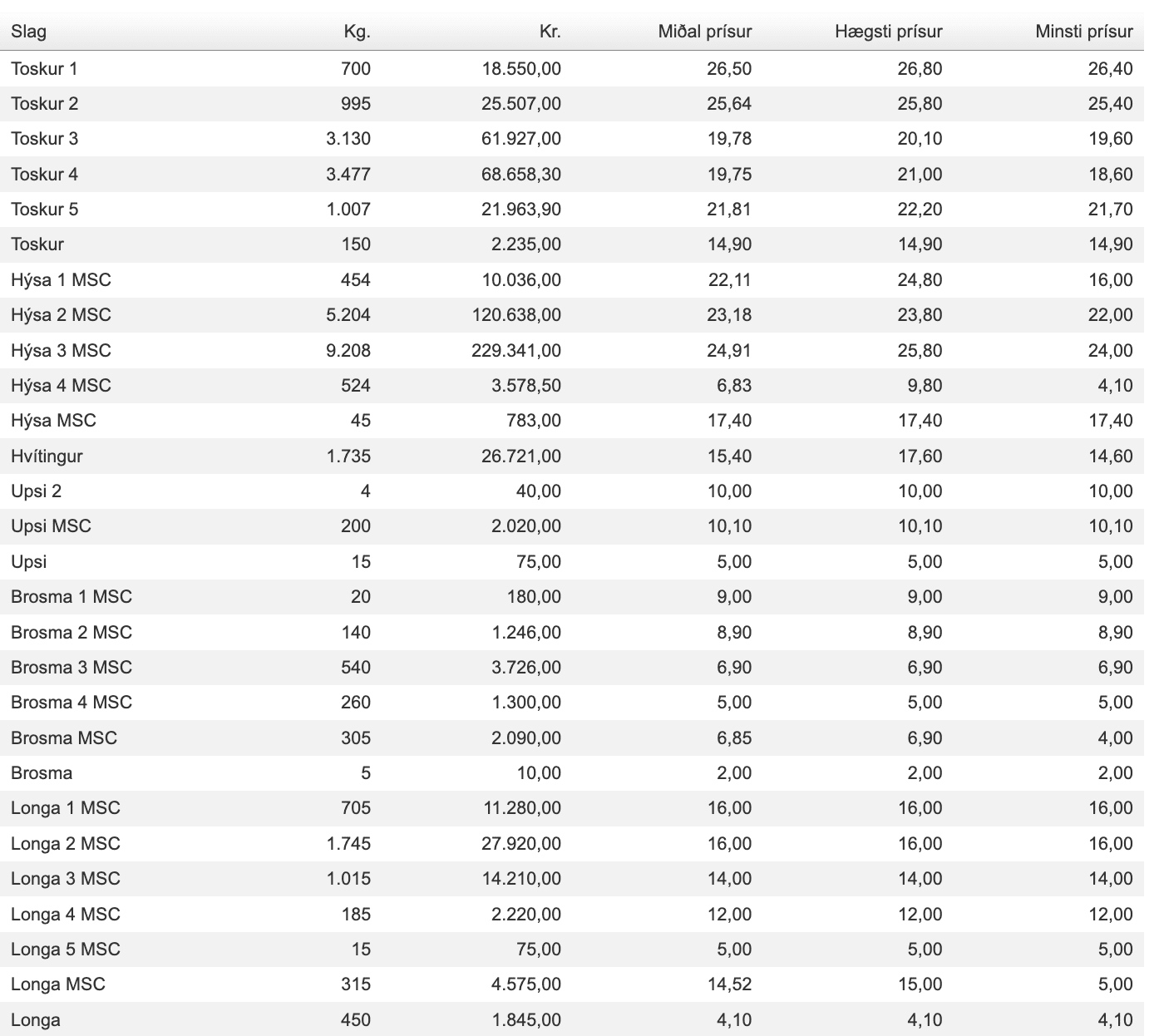 Prísir frá Fiskamarknaður Føroya í dag 27. apríl.