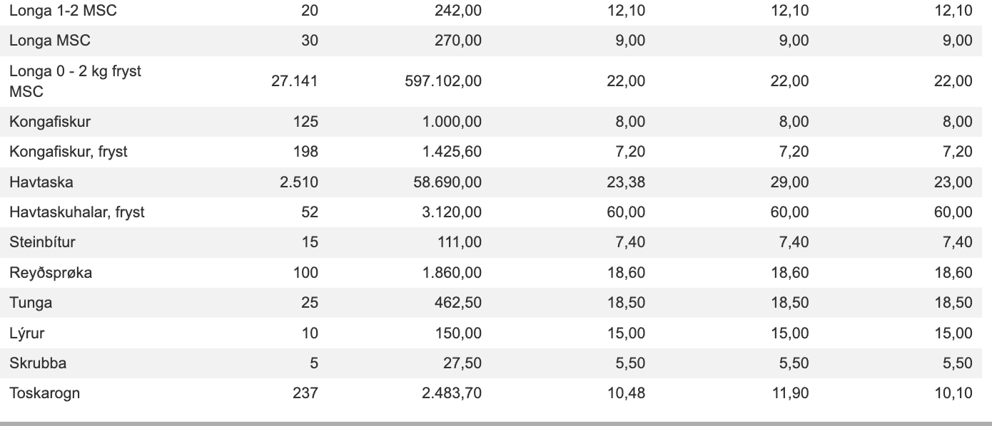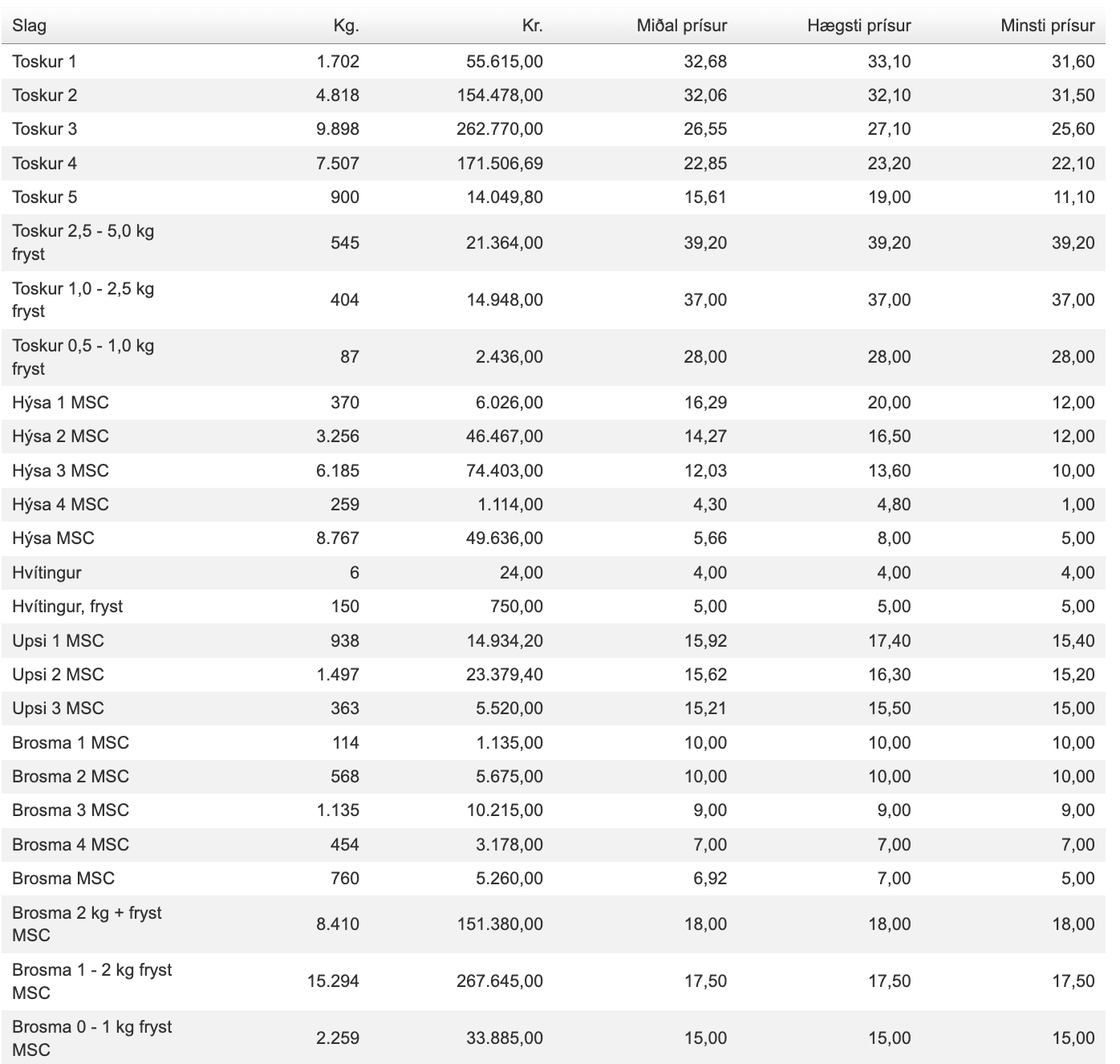 Prísir frá Fiskamarknaður Føroya í dag 27. mars