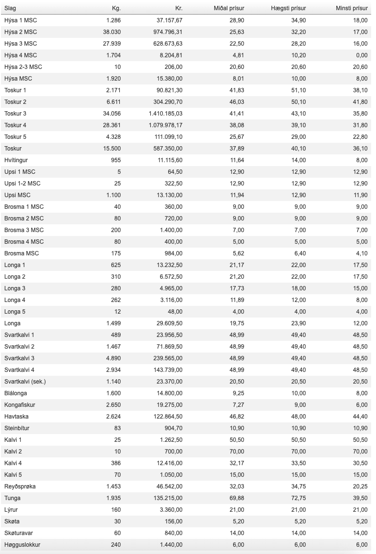 Prísir frá Fiskamarknaður Føroya 27. november.