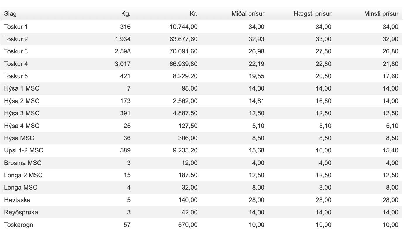 Prísir frá Fiskamarknaður Føroya í dag 28. mars.