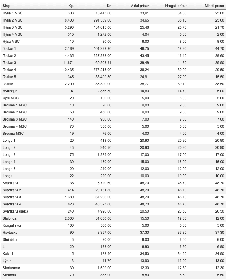 Prísir frá Fiskamarknaður Føroya 3. desember.
