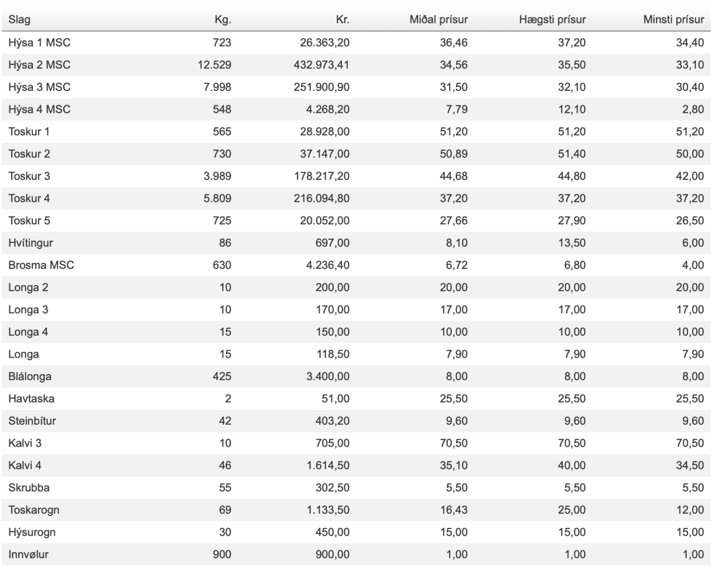 Prísir frá Fiskamarknaður Føroya 30. januar.