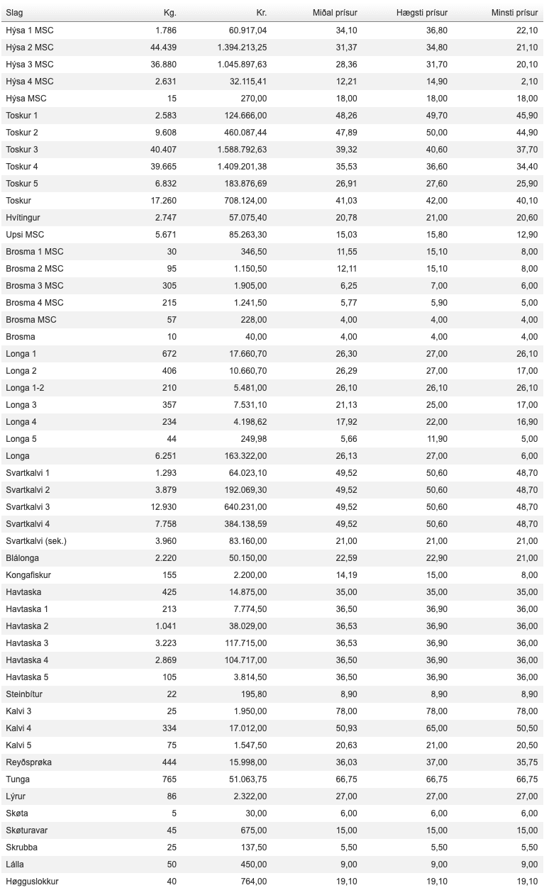 Prísir frá Fiskamarknaður Føroya 30. oktober
