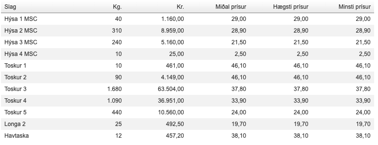 Prísir frá Fiskamarknaður Føroya 30. september.