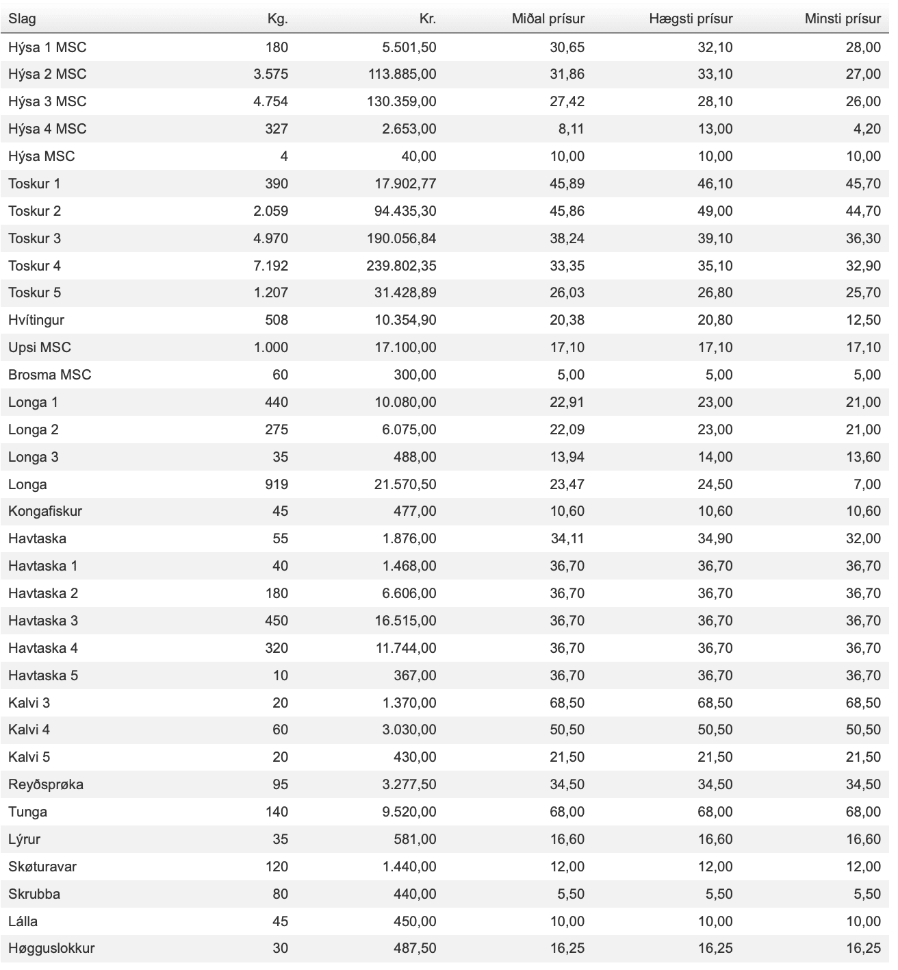 Prísir frá Fiskamarknaður Føroya 31. oktober