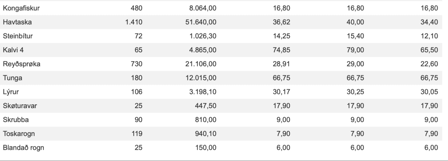 Prísir frá Fiskamarknaður Føroya 4. apríl