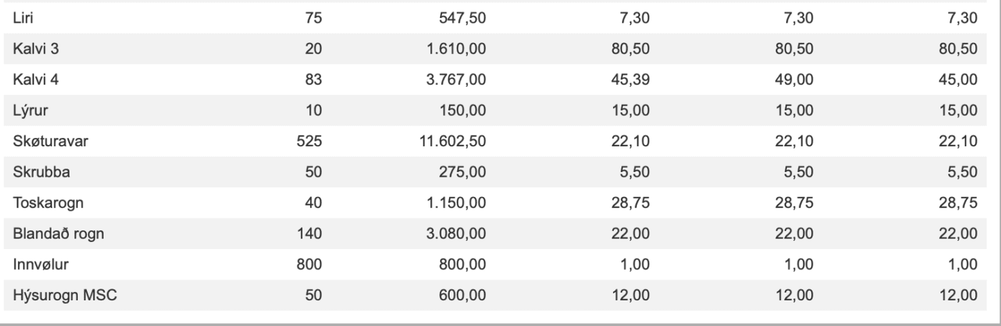 Prísir frá Fiskamarknaður Føroya 5. februar