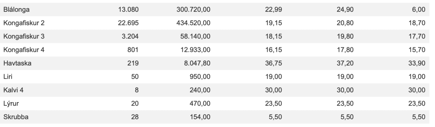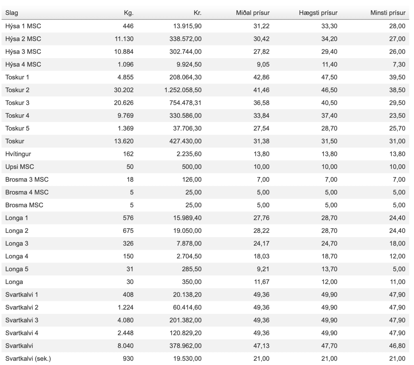 Prísir frá Fiskamarknaður Føroya 5. november.