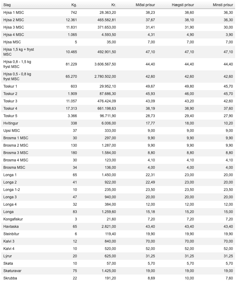 Prísir frá Fiskamarknaður Føroya 8. januar