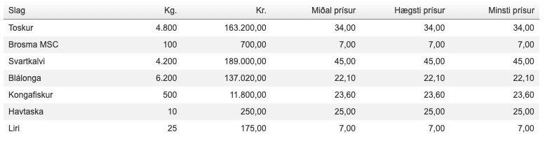 Prísir frá Fiskamarknaður Føroya 7. oktober