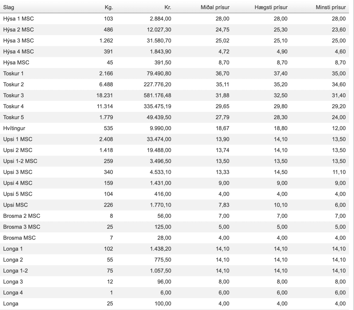 Prísir frá Fiskamarknaður Føroya 8. apríl