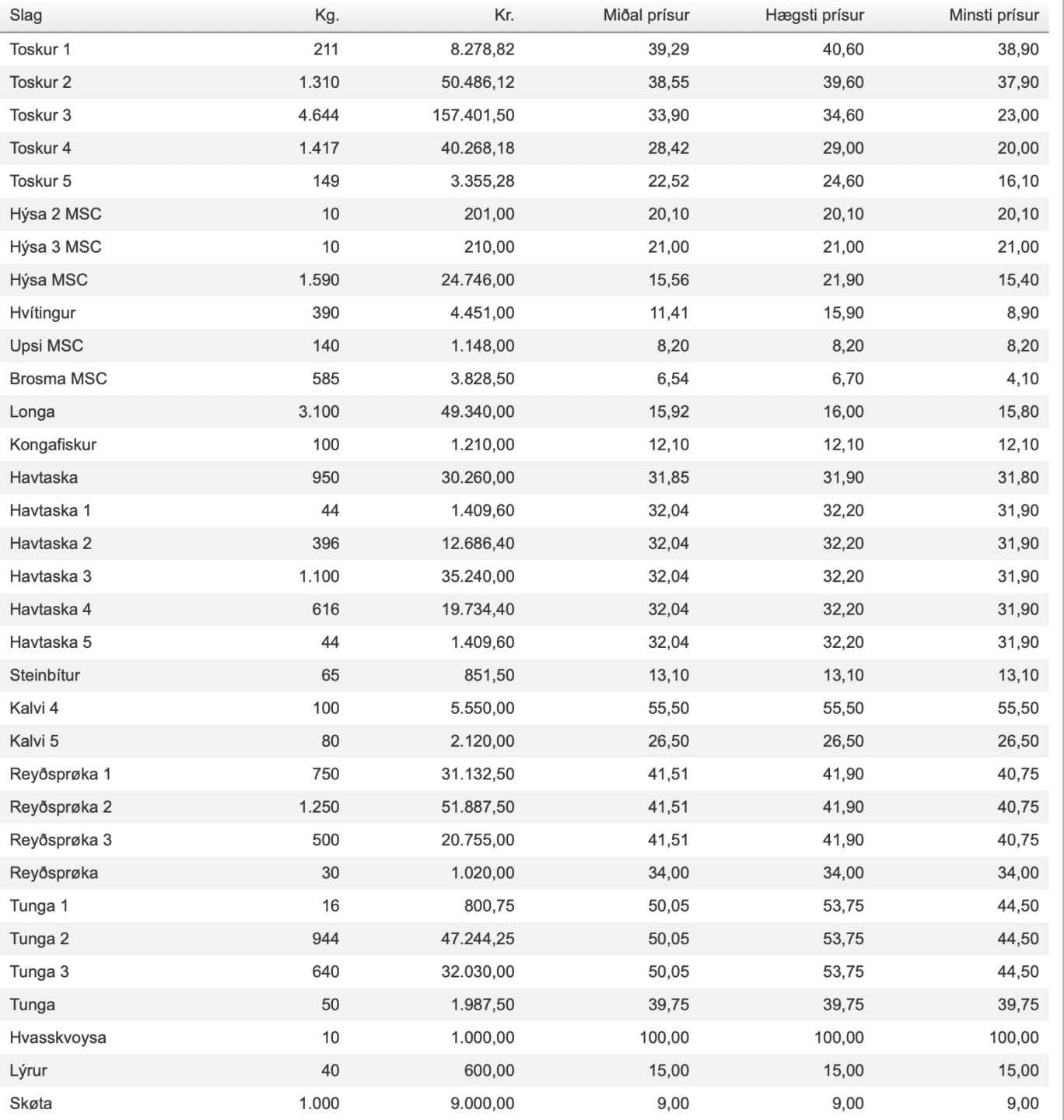 Prísir frá Fiskamarknaður Føroya 8. august.
