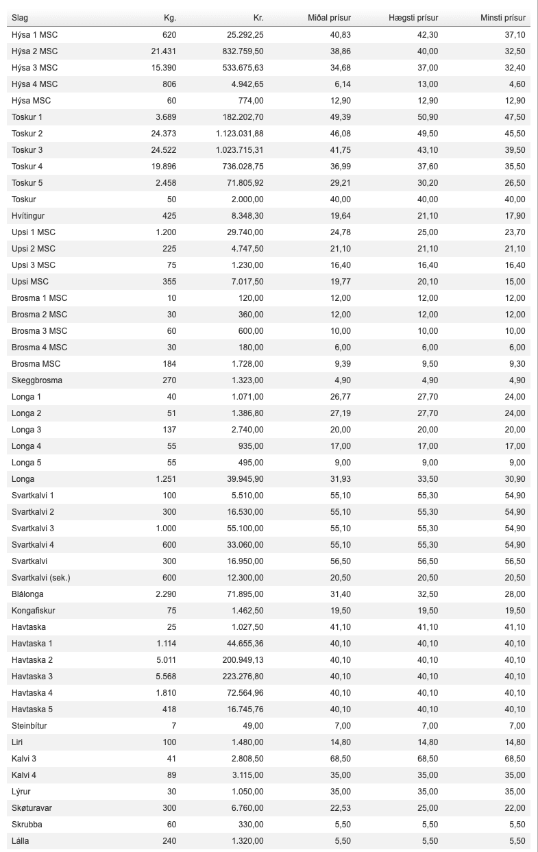 Prísir frá Fiskamarknaður Føroya 8. januar