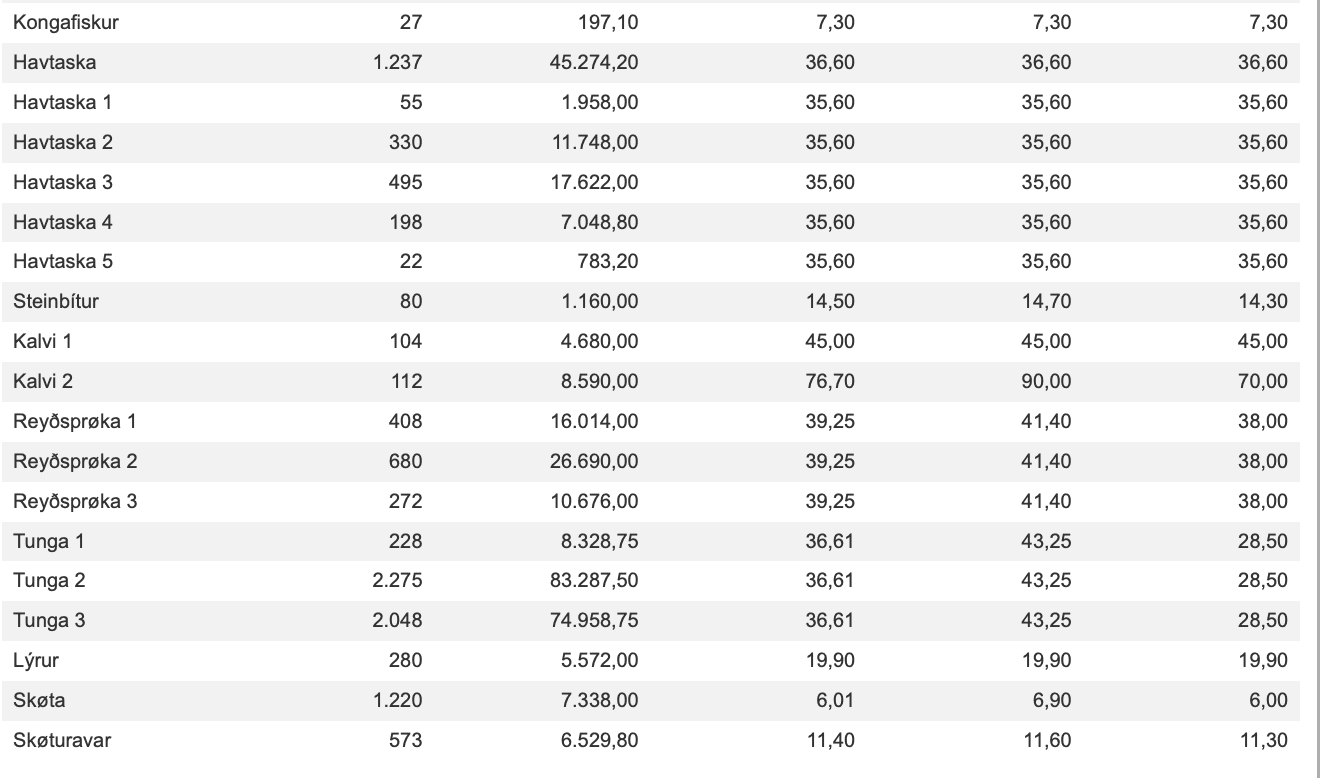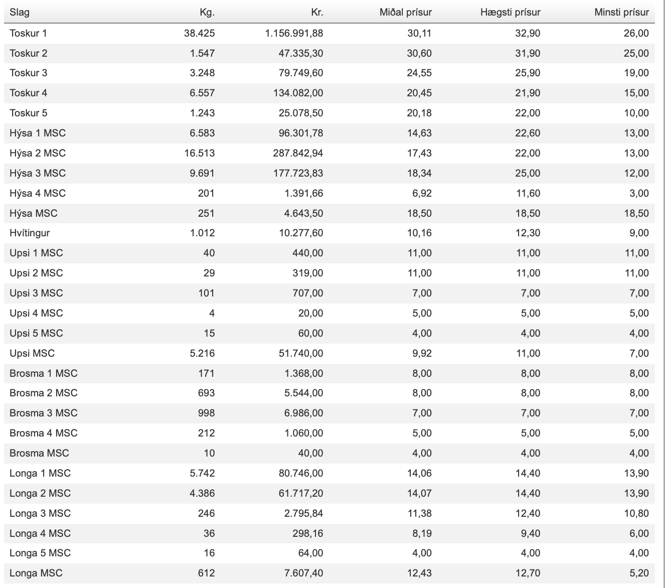 Prísir frá Fiskamarknaður Føroya í dag 9. august