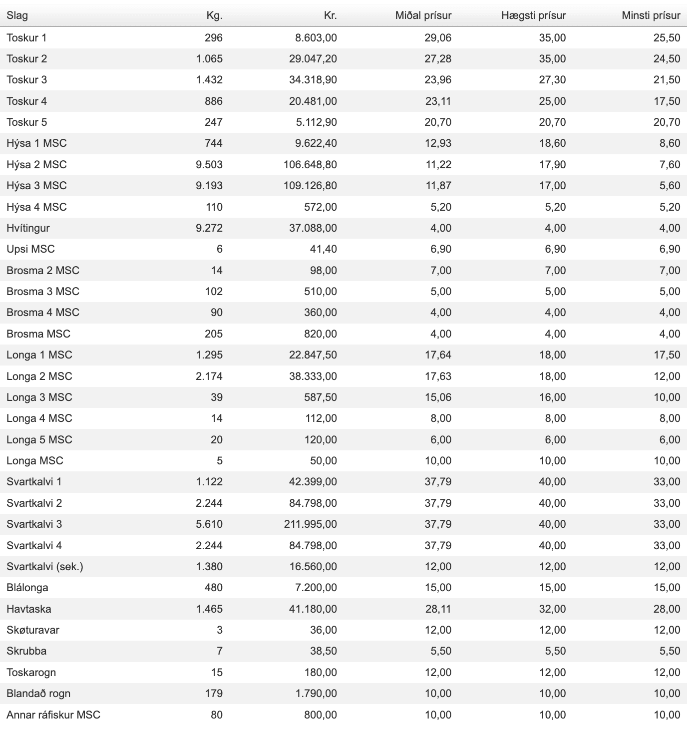 Prísir frá Fiskamarknaður Føroya í dag 9. mars.