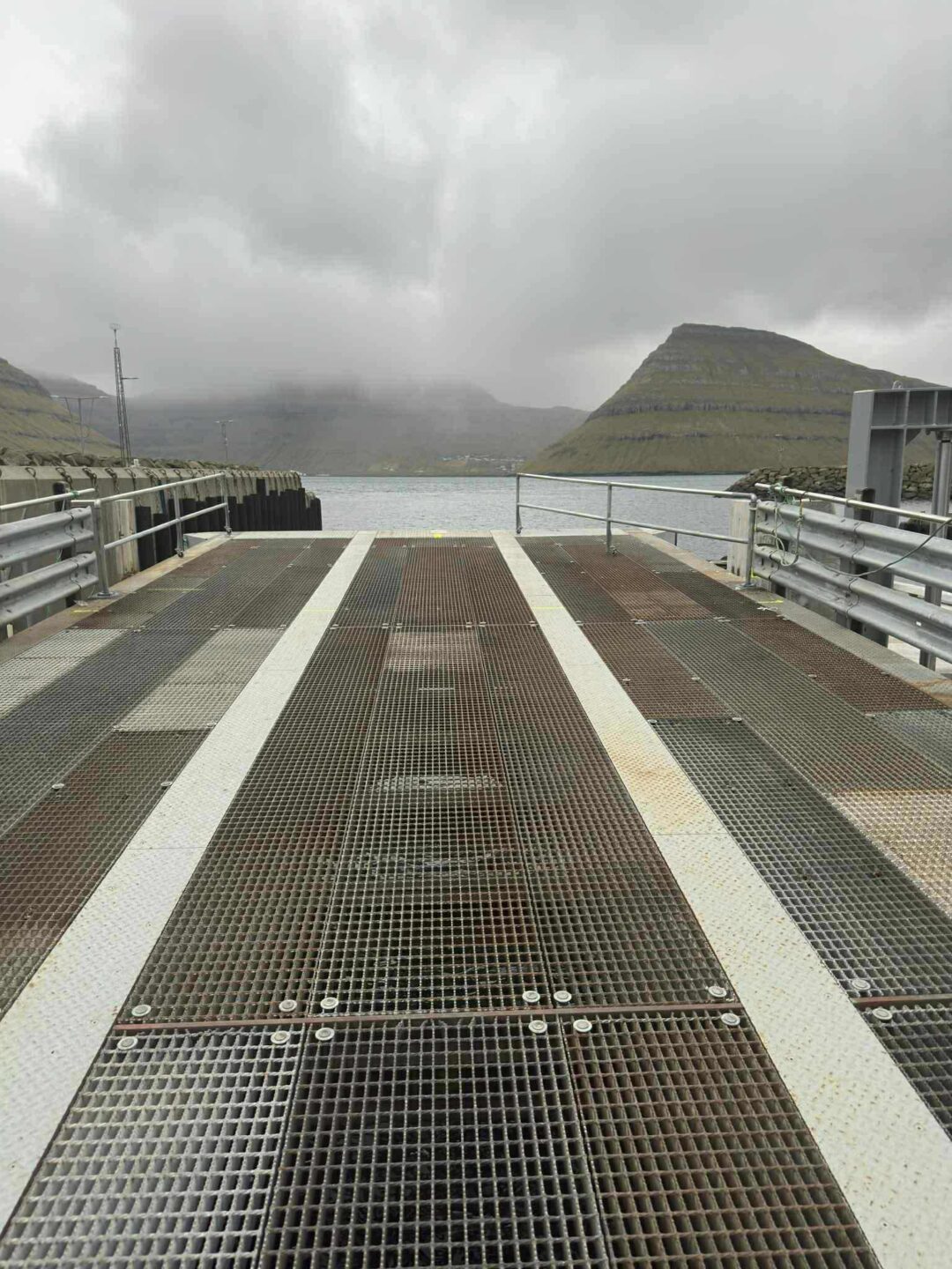 Eisini eru pláturnar ímillum rampuna og asfaltið nú sveisaðar fastar, so tær ikki verða trýstar upp av brimi.