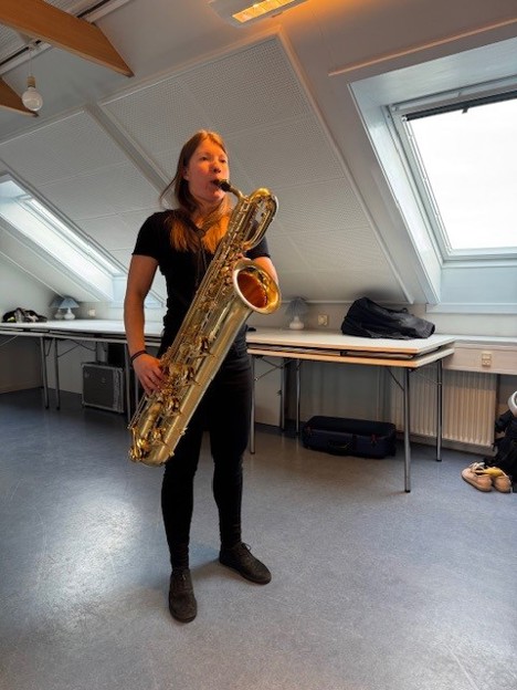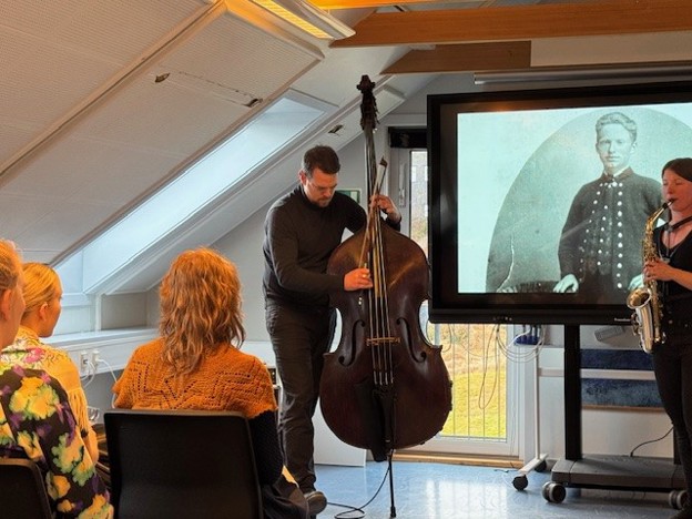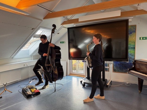 Torleik Mortensen, bassistur, og Kristina Thede Johansen, saxofonistur, tóku fólk á bóli við einum fantastiska sermerktum og krevjandi tónaverki. – Ongantíð áður havi eg hoyrt nakran syngja gjøgnum saxofon, segði ein lurtari, sum var sjónliga bergtikin av Kristinusa handfaring av sínum instrumenti. – Ja, har síggja tit, hvat long útbúgving kastar av sær!, segði Marita Dalsgaard, bergtikin, tá hon bukkaði fyri teimum báðum.
