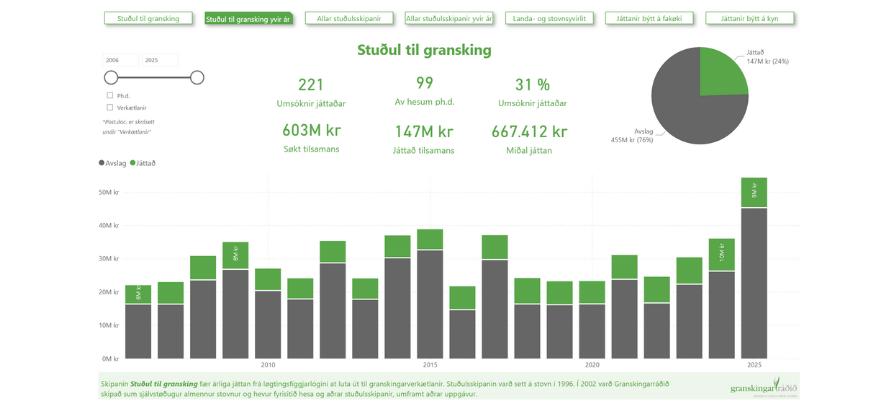 Granskingarráðið hevur savnað upplýsingar um allar stuðulsumsóknir og játtanir í eitt samvirkið yvirlit, sum er lagt á heimasíðuna. Sí yvirlitið her