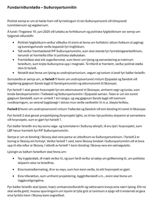 Í farnu viku fingu øll løgtingsfólk kunning um avgerðarnotatið, sum P/F Suðuroyartunnilin og ráðgevin, Norconsult, hava latið úr hondum. Floksforfólkini í øllum flokkum á Løgtingi fingu til uppgávu at venda aftur við eini avgerð um, hvørja linjuføring flokkarnir mæla til.