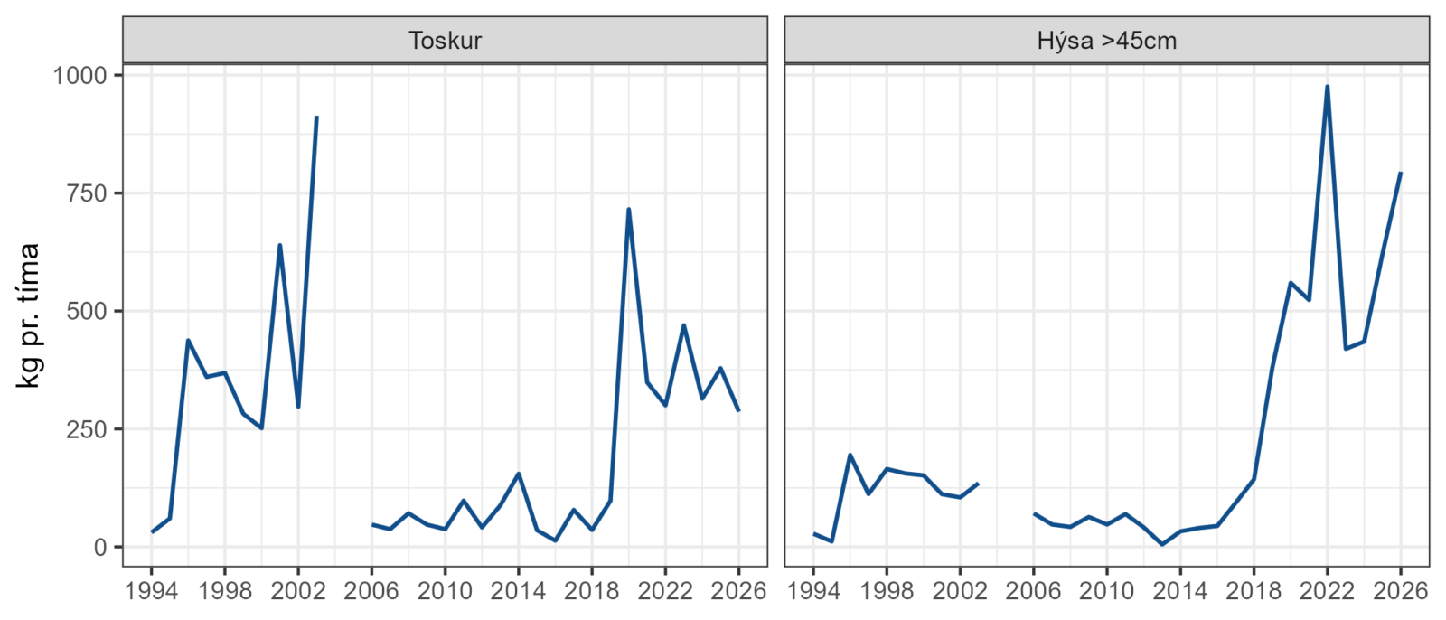 Bæði toskur og hýsa eru rakari enn tey hava verið síðstu árini (Mynd 3), og var heldur lítið av føði í magakanningunum. Hetta gevur ábendingar um, at tað er minni av føði hjá fiskinum á Bankanum í løtuni.