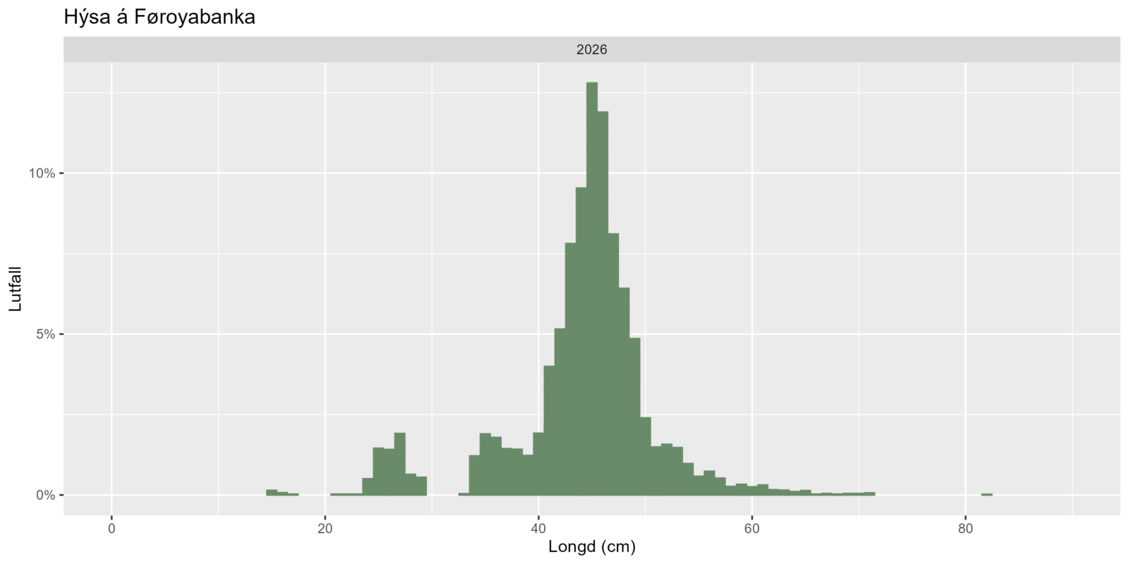 Mest varð fingið av hýsu (Mynd 1), og var meginparturin av hýsuni millum 40 og 50 cm (Mynd 2). Nøgdin av toski er á sama støði sum síðstu árini (Mynd 1), og tó varð nakað meira fingið av smærra toskinum í mun til síðstu árini (Mynd 2).