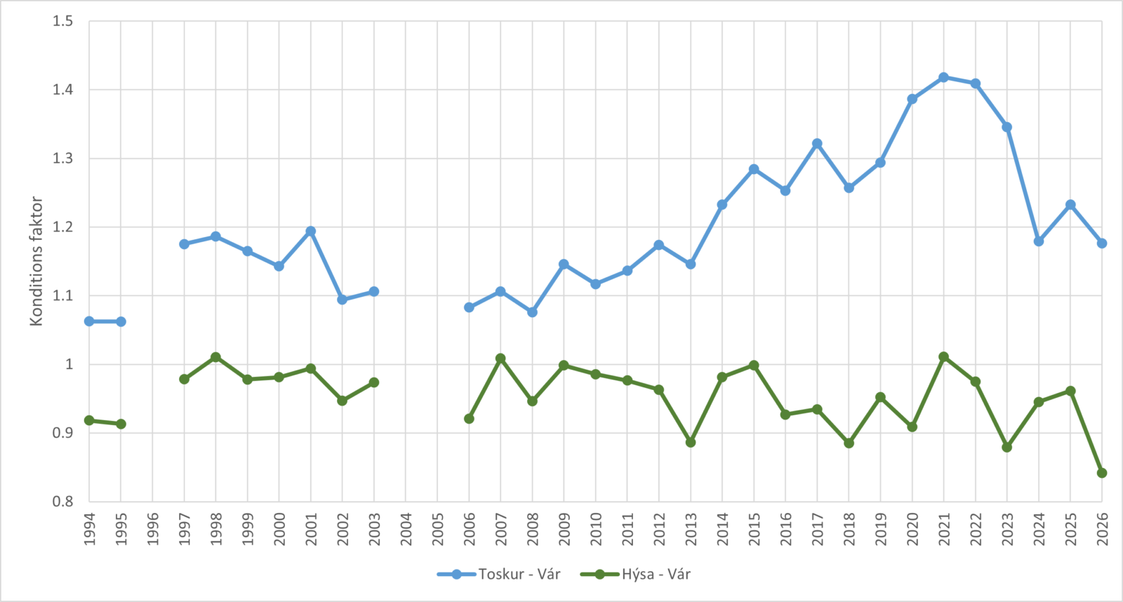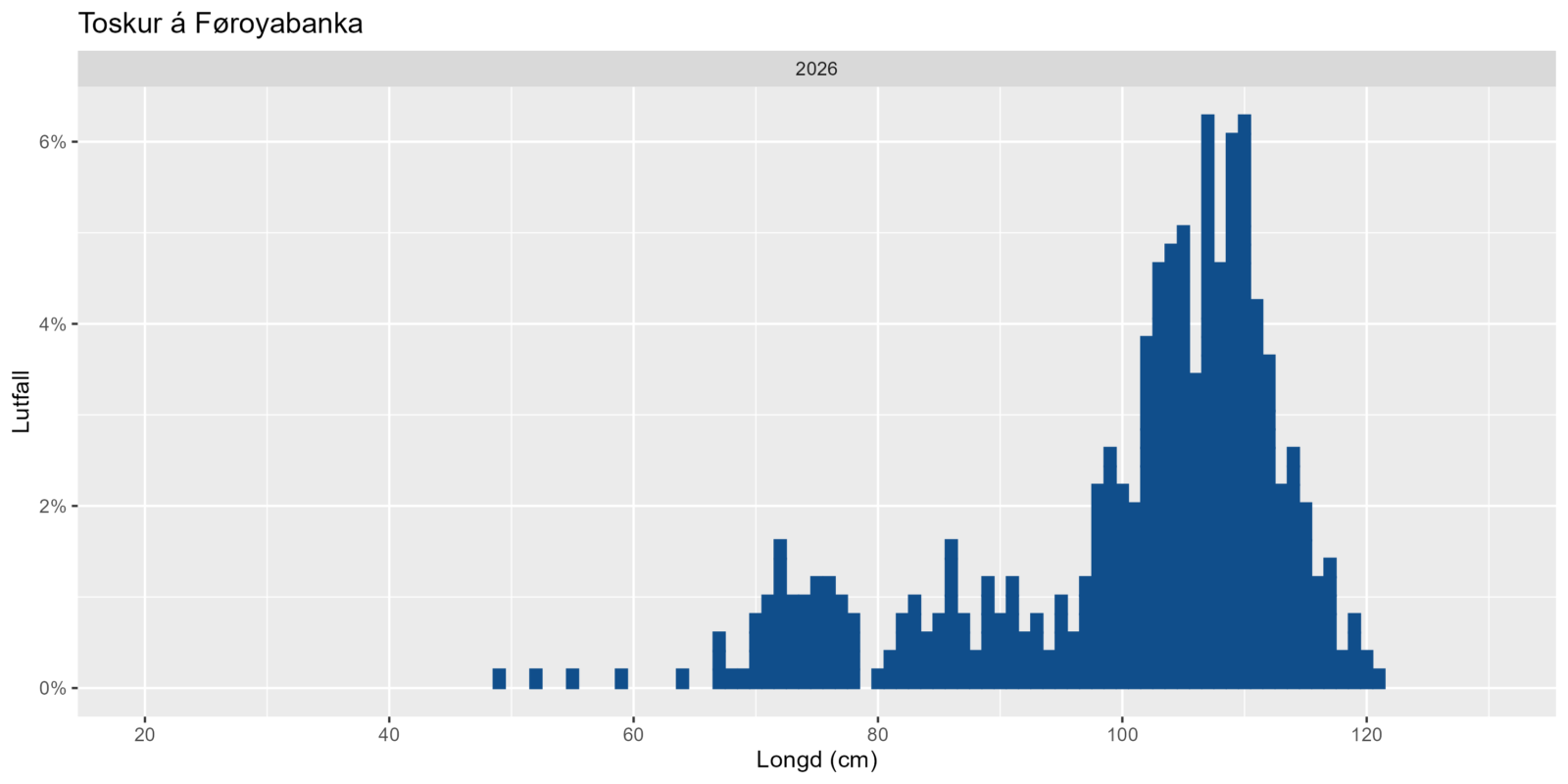 Mynd 2: Hýsa (grønt) og toskur (blátt) . Longdarbýti á Føroyabanka á vári í 2026.
