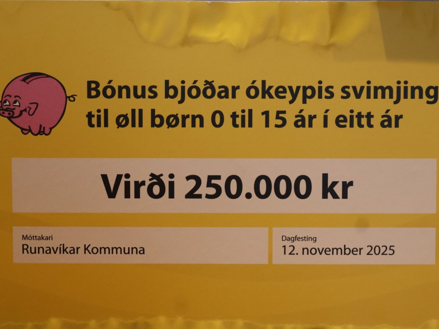 ES: Áðrenn snórurin við dyrnar var kvettur, handaði Niels Mortensen borgarstjóranum Tórbirni Jacobsen ein kekk. Virðið er ein fjórðingsmillión krónur – 250 túsund krónur – og tað er ætlað ungdóminum millum 0 og 15 ár soleiðis, at hesi kunnu svimja uttan kostnað í 2026. Runavíkar kommuna takkar vegna móttakaran hjartaliga fyri gávuna.