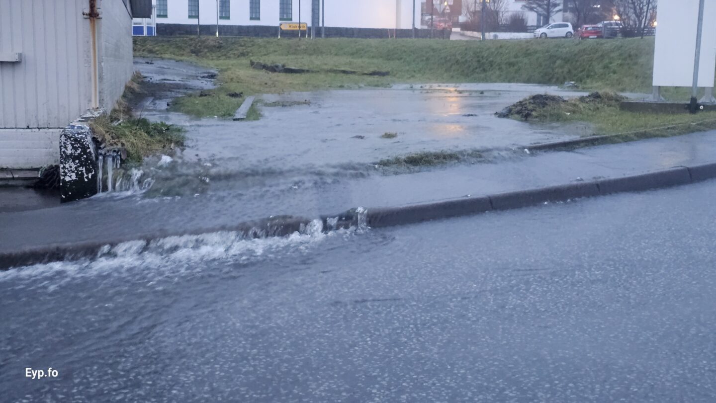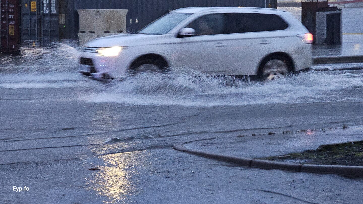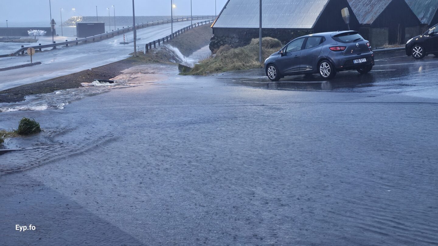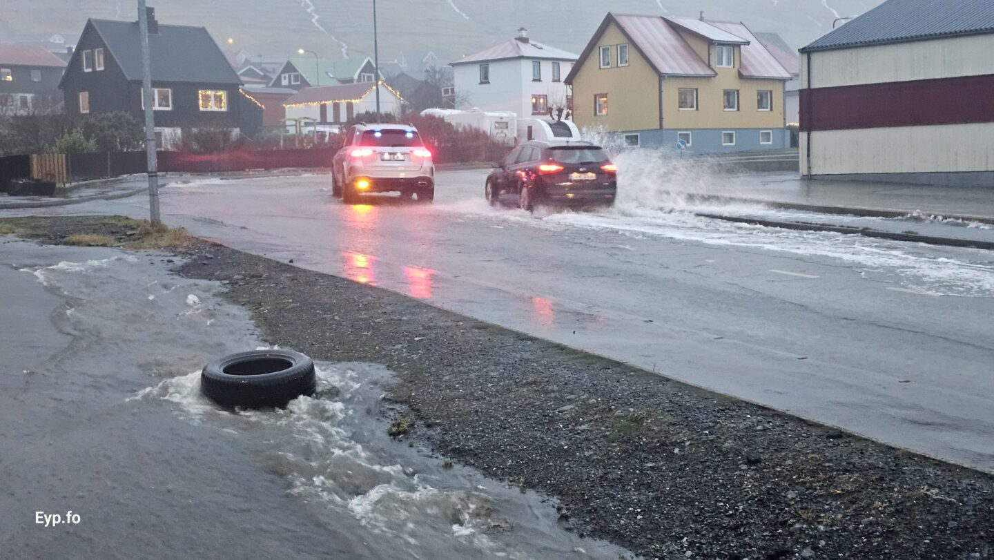 Í Leirvík er í løtuni sera nógv vatn á vegnum í bygdini og tarnar tað eisini ferðsluni.